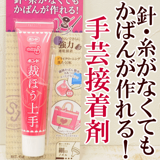 簡単可愛いバッグを作れるようになるコツは? なんと、針も糸も使わずに楽チンソーイング! 新開発の「ボンド 裁ほう上手」 画期的な手芸用ボンドです! ミシンで縫うより1.5倍の強度があります。