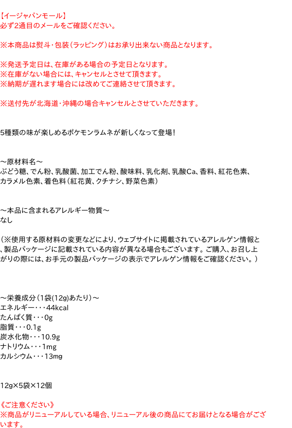 5種類の味が楽しめるポケモンラムネが新しくなって登場! 〜原材料名〜 ぶどう糖、でん粉、乳酸菌、加工でん粉、酸味料、乳化剤、乳酸Ca、香料、紅花色素、カラメル色素、着色料(紅花黄、クチナシ、野菜色素) 〜本品に含まれるアレルギー物質〜 なし (※使用する原材料の変更などにより、ウェブサイトに掲載されているアレルゲン情報と、製品パッケージに記載されている内容が異なる場合もございます。